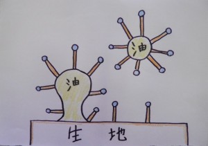 マヨネーズは界面活性剤の親油基(マッチ棒の軸)の部分がサラダ油の方を向いて油の粒を細かくして包み込み、お酢